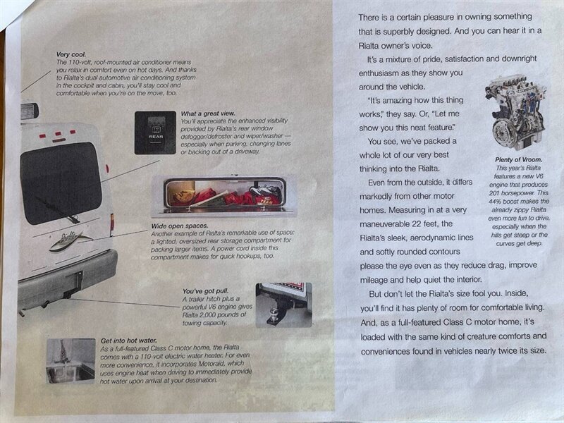 This 22HD configuration is popular because it’s versatile for couples or solo travelers, easy to maneuver on highways and through tight campsites, and efficient enough to make long-distance trips a joy rather than a chore. If you’re looking for an RV that feels like a trusted travel companion — practical, reliable, and uniquely comfortable — the 2001 Winnebago Rialta 22HD with its single center seat with 2 front seats rotating backword is a choice many owners rave about.....