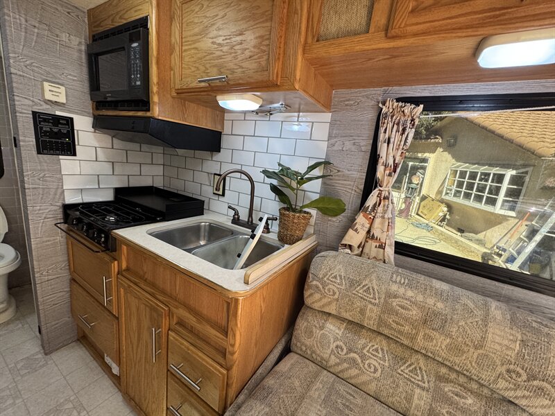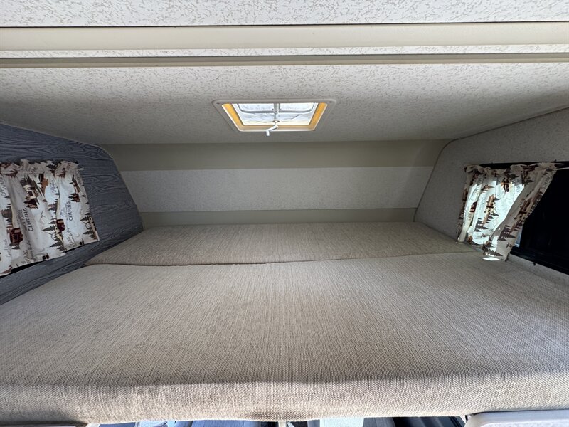 The Volkswagen platform looks quite different compared with those equipped with big-block V-8 engines, as most type C motorhomes today are. Independent front torsion bar suspension, rack-and-pinion steering, and power-assist steering all contribute to the Vista’s responsiveness and handling. Four-wheel disc brakes are standard. The coach’s low, sporty appearance is further accented by the inclusion of standard 16-inch aluminum wheels.. For ease of access, the driver and passenger doors are designed to open almost a full 90 degrees. The sofa is converted into a bed, It nicely accommodates a couple of children. The cabover bed is 49 inches wide and 80 inches long, and can sleep one adult or two children.