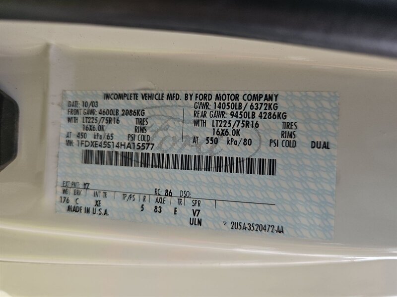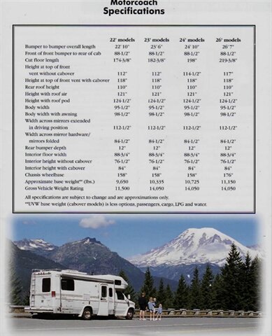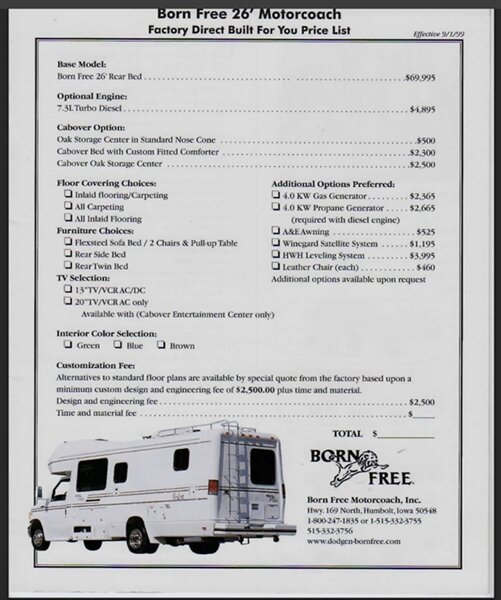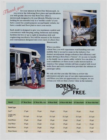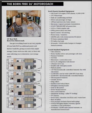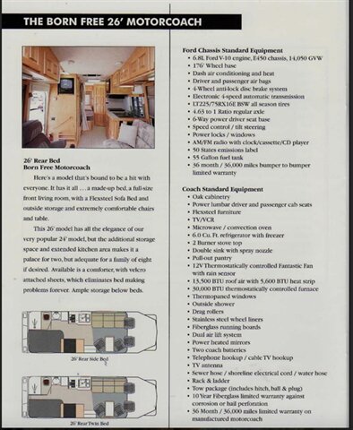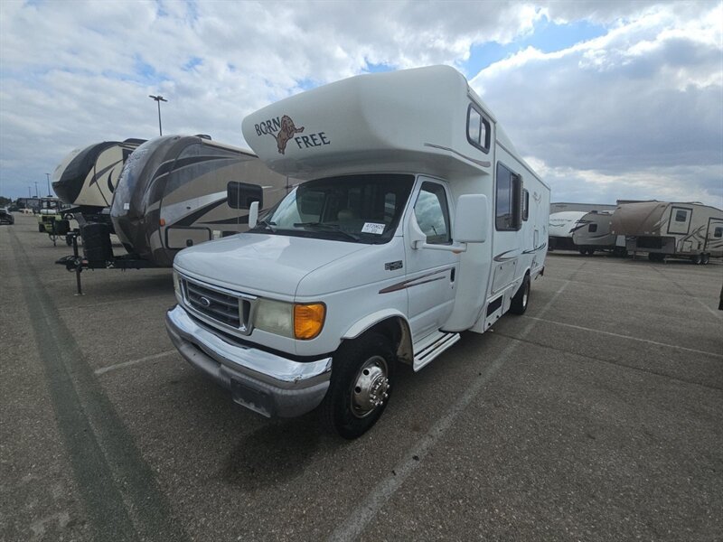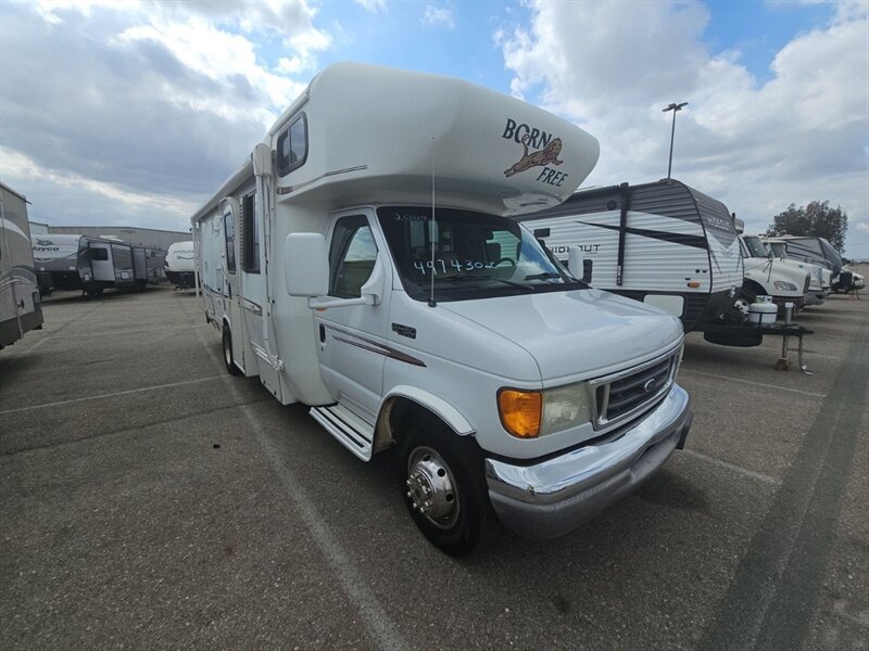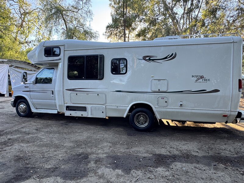 2004 Born Free 26RB - 26.5' bumper to bumper - 6.8L Triton V10 engine - Ford E450 chassis - 16 foot power awning - Tow package - 2 burner cooktop - Microwave/convection oven - The tires have date codes of 4521 - 4 seat belts - Generac 4k gas generator with 250 hours - Rooftop A/C - Ducted furnace - 24 inch LG flat screen TV - Holding tanks - Fully self contained - In the cabin area there are power windows, power locks, tilt, cruise, power heated mirrors, and CD player- This Born Free is ready to hit the highway