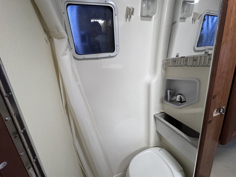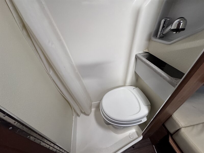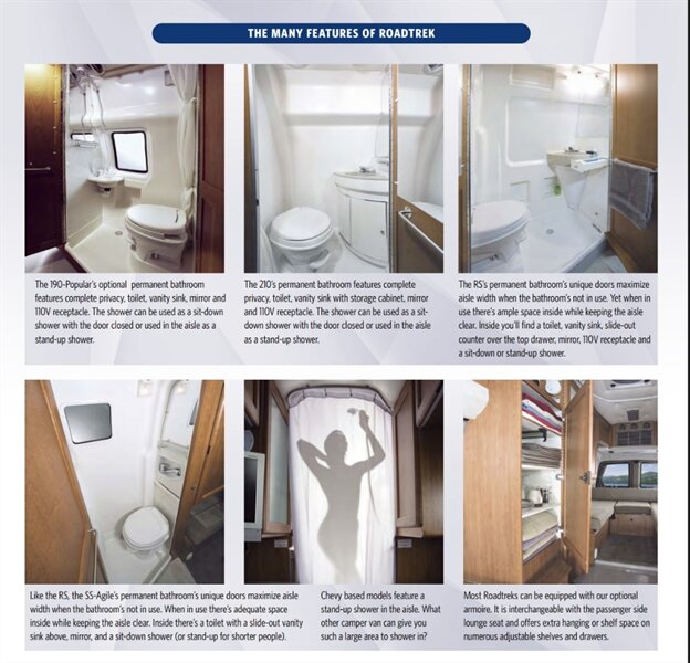 The Roadtrek SS-Agile is based on the 144" wheelbase Sprinter 2500 van. At only 19 feet long, the SS (“Short Sprinter”) is perfect for those who want a vehicle that’s really as easy to use everyday as a large crossover or conversion van also due to many city regulations people can park this in their driveway & one that offers all the conveniences of a fully-equipped motorhome – and has awesome fuel economy! The 144" wheelbase Sprinter van has the same specifications as the 170" wheelbase van used for our RS (“Regular Sprinter”) model except the body and interior length are 40" shorter, overall length is 19', turning radius is 7' smaller and the weight ratings are lower. Inside the SS you’ll find a great passenger vehicle for five within a fully-equipped class B that sleeps two. There is comfortable forward facing seating for five with the two front captain seats and rear electric power sofa seating three. Opposite the 59" long fully-equipped galley is a permanent bathroom. Its unique doors allow ample aisle width when the bathroom’s not in use. But when in use the doors allow extra space inside while keeping the aisle clear. Inside the bathroom you’ll find a marine toilet, vanity sink that slides out over the toilet, and sit-down shower (or stand-up for smaller people).