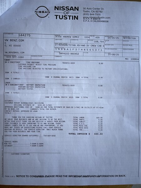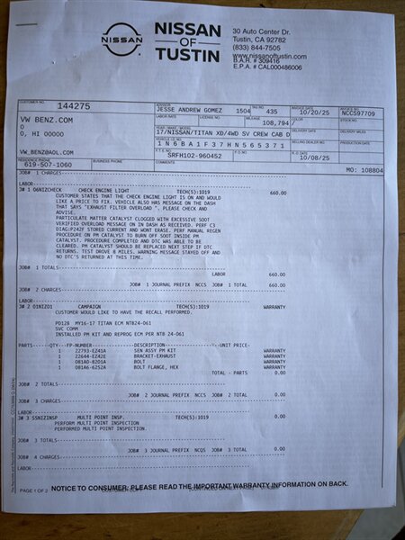 Has had 2 private 2 owners, all new complete service by NISSAN OF TUSTIN new Bilstein German shocks smog oil filters def system fluids..., The 2016 Nissan Titan XD is a new semi-heavy-duty pickup powered by a diesel engine and built on a totally new heavy-duty chassis. Equipped with a 5.0-liter Cummins that punches out 555 foot-pounds of torque, the Titan XD is rated to tow up to 12,300 pounds. 310 hp, 550 lb-ft of torque courtesy of CumminsTitan XD rides more smoothly and costs less than the heavy-duty Chevy Silverado 2500, Ram 2500, and Ford F-250 Super Duty, but it's more capable than the light-duty Silverado 1500, Ram 1500, and F-150. Adding the $3310 Pro-4X Convenience package (heaters for the steering wheel and four of the five seats plus leather hides all around) along with the $1100 Pro-4X Utility and Audio package (a Rockford Fosgate stereo, front and rear parking sensors, and a host of tie-downs in the cargo bed) was a sounder decision than our trim-level choice. Our Pro-4X’s lack of any assist steps for an as-tested $57,155 truck. the Titan XD eagerly tackled every job we threw at it. Although the Titan XD is targeted at the slim market segment of consumers needing something in between a half-ton and a three-quarter-ton, we would likely opt for a modern half-ton pickup if we needed to haul more than 1,600 pounds regularly, or a modern three-quarter-ton pickup if we needed to tow more than six tons on a regular basis.