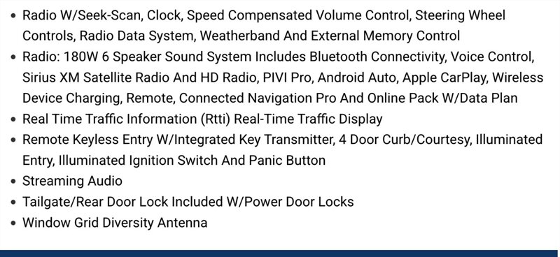 - Radio: AM/FM, HD radio, touch screen display, voice operated