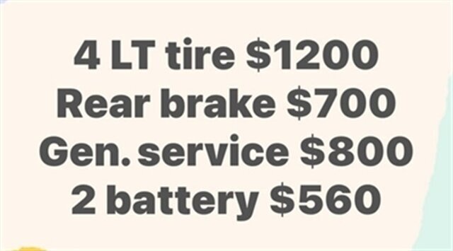 2/226 just had sprinter shop service for $3,200, NEW TIRES $2000 NEW BRAKE $3000 NEW BATTERY $400 NEW PAINT $2800 NEW BACK UP CAMERA$400 New LP GENERATOR Had only 67 hours on generator serviced $800…….