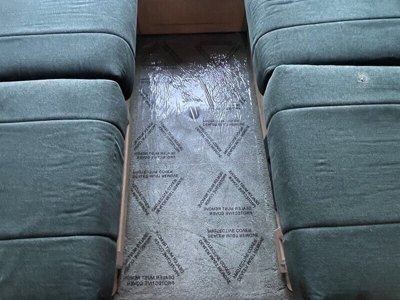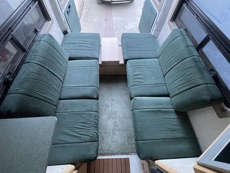 The driver and passenger seats and rear seating are all ultra-leather fabric. The front passenger seat swivels to provide an added sitting space when parked. the rear of the Plateau from a dining area during the day to a 74 x 68 queen bed at night.